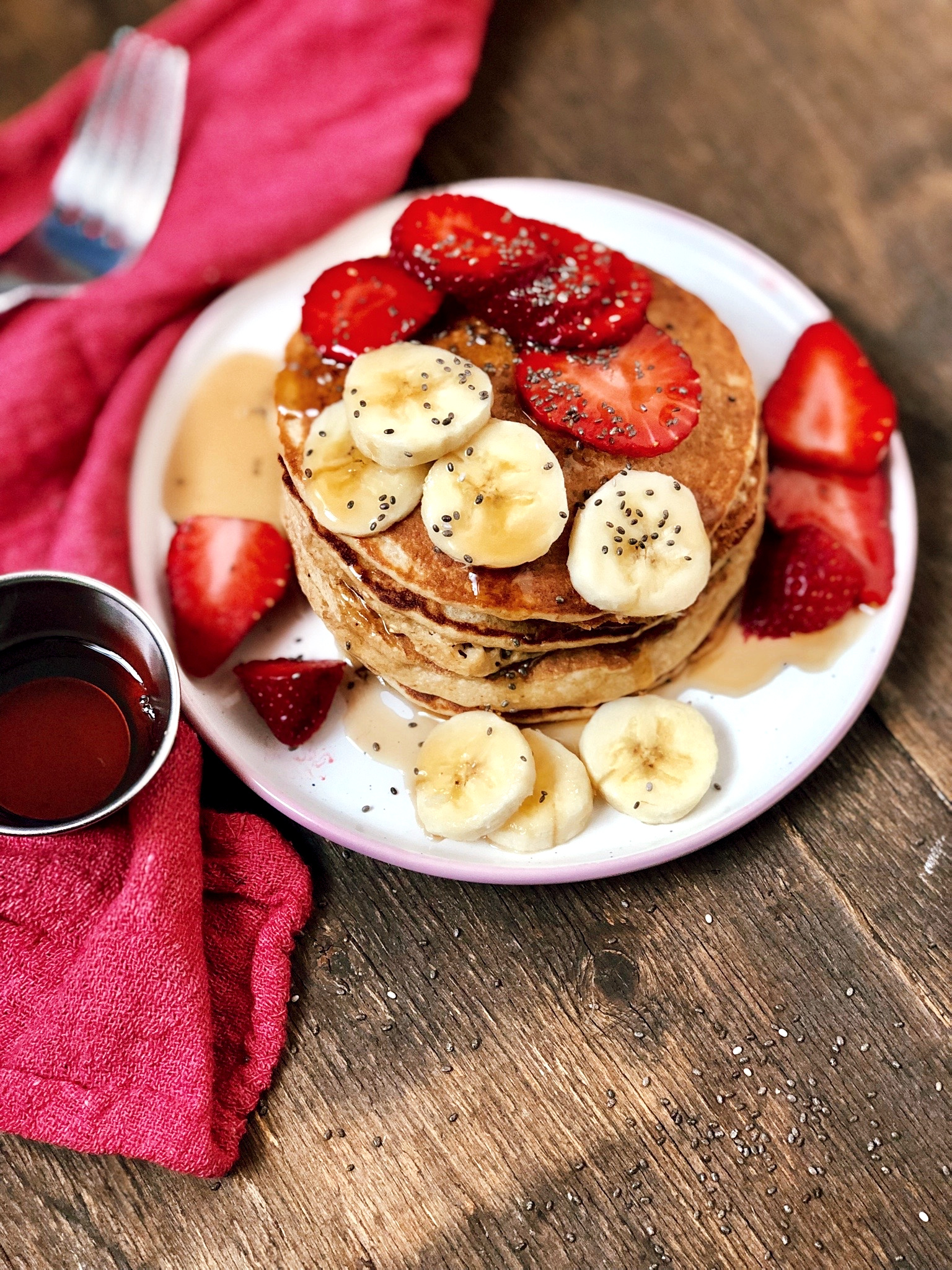 Sweetness in these pancakes comes exclusively from the mashed bananas. I never understood why some recipes that call for ripe bananas also have sugar listed among the ingredients. Good quality ripe bananas have enough natural sugars in them to sweeten a whole banana bread. And considering that you will most likely be topping your pancakes with maple syrup and/or fruit, you will have all the sweetness you need with no added sugars.