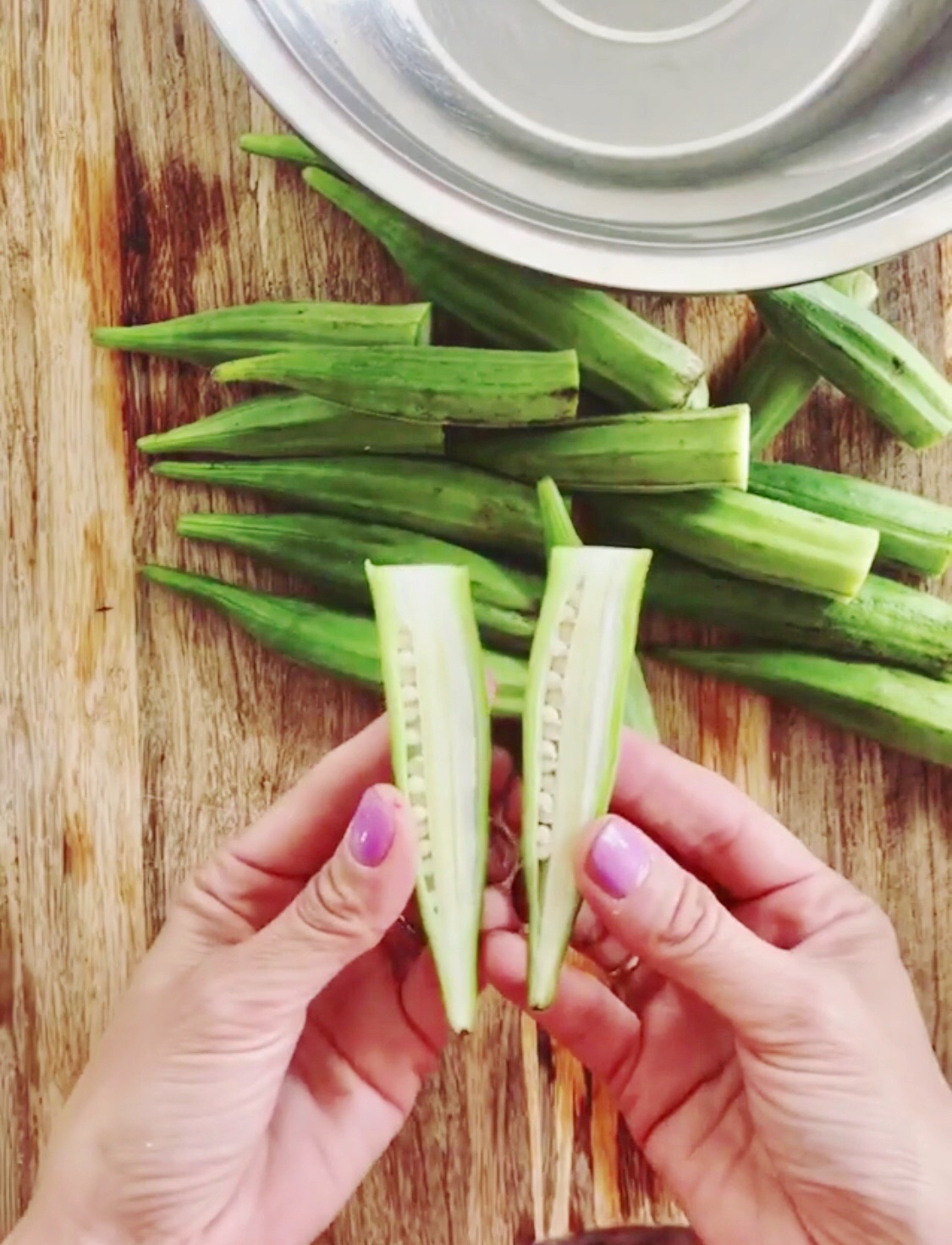 - Trim the stems of the okra and cut them all in half lengthwise.