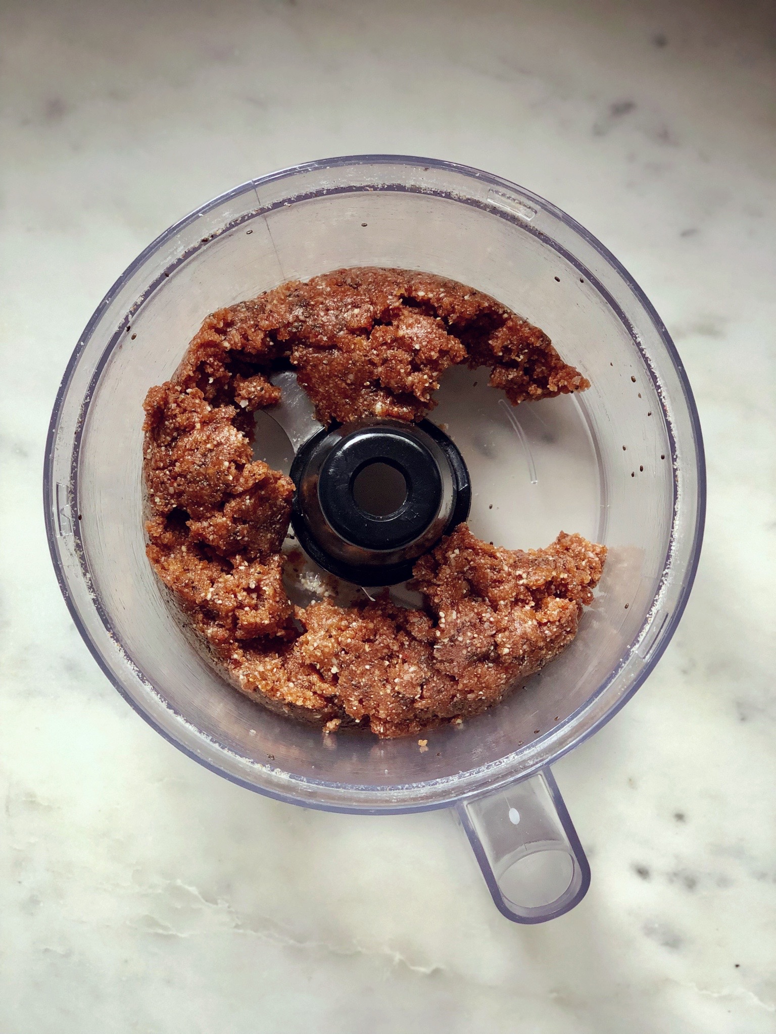 3. Tritura durante 30s ó 1 min (esto va a depender de la potencia de tu procesador). Deberías conseguir una masa apelmazada y pegajosa. Si te ha quedado un poco suelta la mezcla es porque está un poco seca. Solo tienes que añadirle un hilito de agua y triturar de nuevo. Añade agua a poquitos hasta que se forme la masa. No deberías necesitar más de uno o dos hilitos de agua.