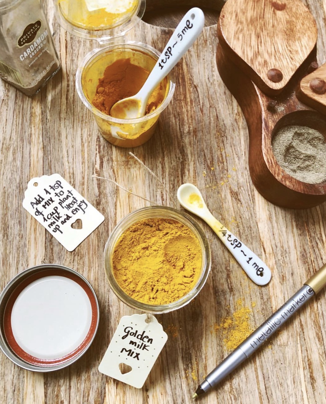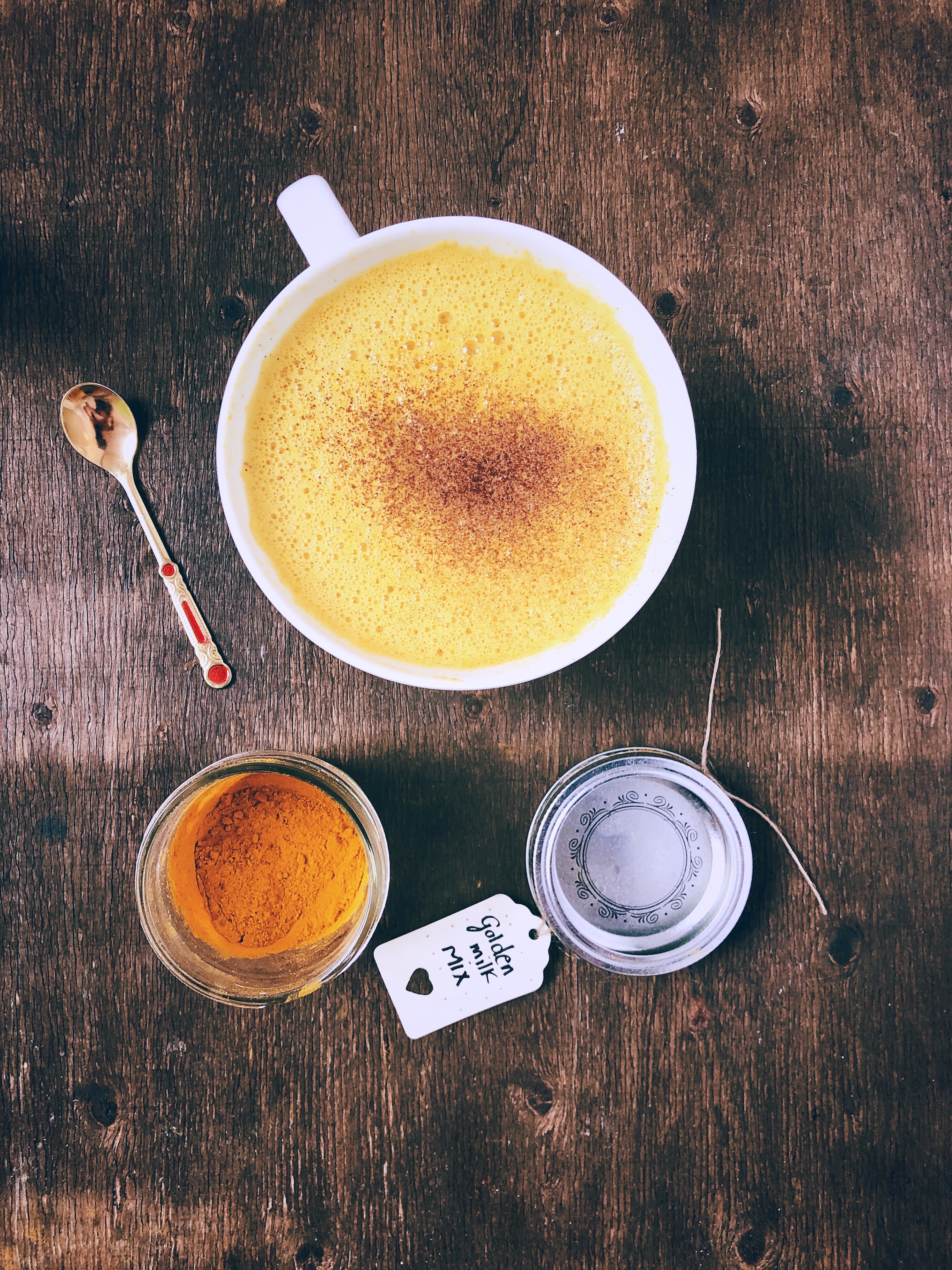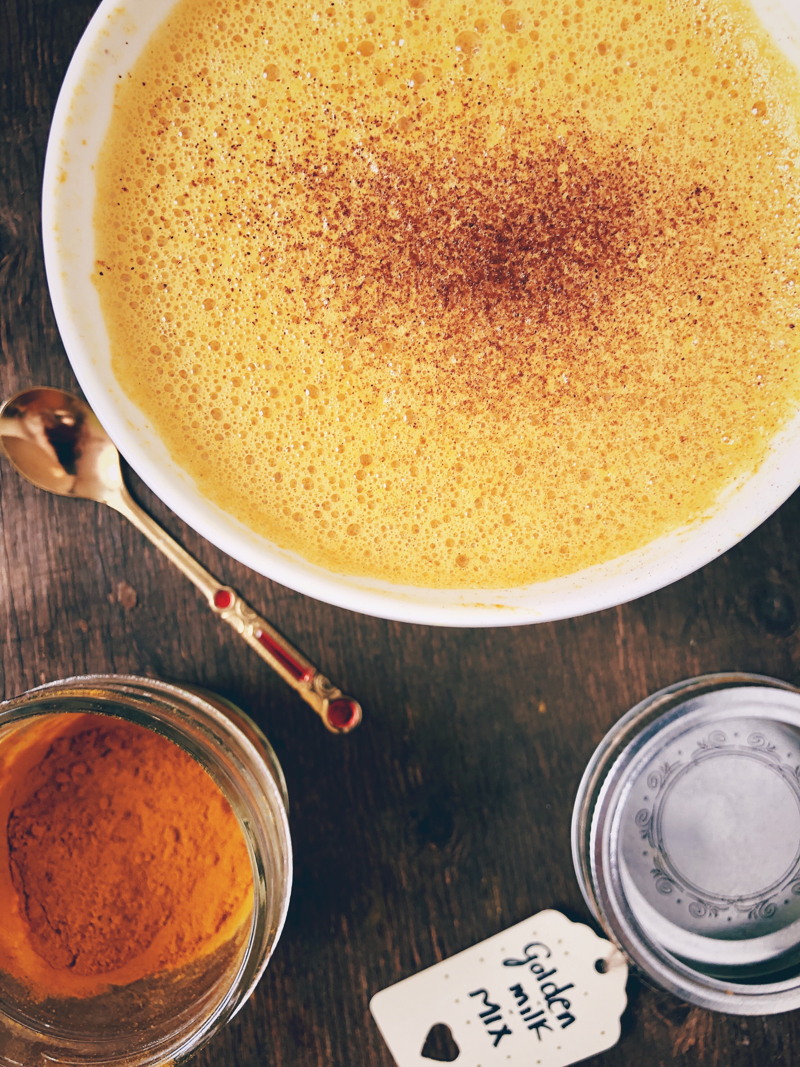 - Puedes hacer la mezcla de especias en grandes cantidades (respetando las proporciones de cada ingrediente) y guardarla en un recipiente hermético. De este modo sólo tendrás que añadir una 1 1/2 tsp de la mezcla a una taza de leche y endulzar al gusto y tendrás golden milk siempre rápido y listo. Además, un tarrito con una mezcla de especias para golden milk es una idea de regalito súper bonita, natural y especial que hará las delicias de foodies y no foodies.