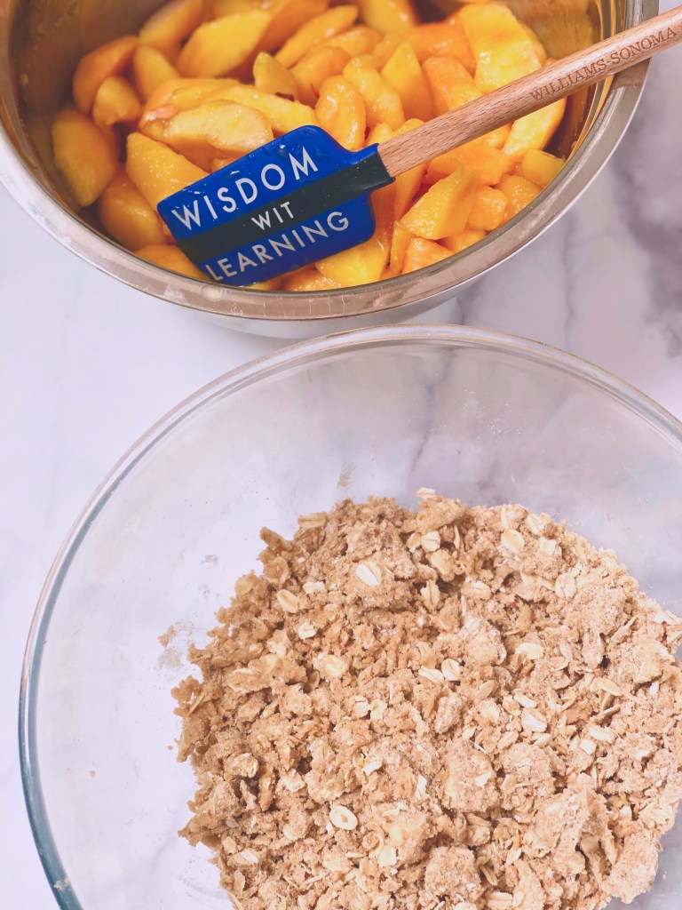 - Sprinkle crisp topping evenly over the peaches.