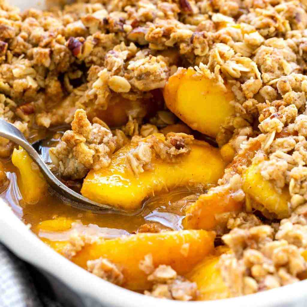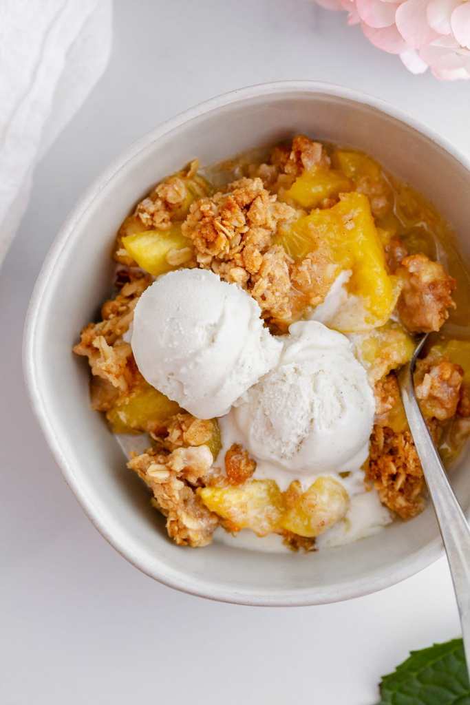 2. Use canned peaches. To me nothing compares to the flavor of fresh peaches but you can totally make this recipe with canned peaches (in their own juice, not in syrup) and you will have peach crisp all year long.