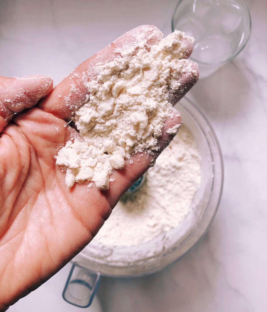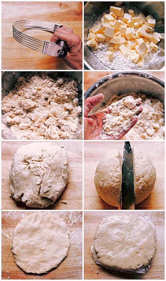 2. La segunda clave es usar un procesador de alimentos. En realidad esto no es imprescindible pero hace que el proceso de hacer masa de pie de principio a fin sea cuestión de un máximo de 5 minutos. En cualquier caso no pasa nada si no lo tienes. Las abuelas americanas llevan haciendo pies sin problemas desde que atracó el Mayflower. Es igual de fácil. Solamente se tarda un poco más porque tendrás que integrar los ingredientes usando dos tenedores, un pastry cutter, o las manos. Si lo haces con las manos vas a transferir más calor a la mantequilla por lo que tendrás que trabajar rápido o parar alguna vez y meter los ingredientes en la nevera unos minutos para que la mantequilla se enfríe.