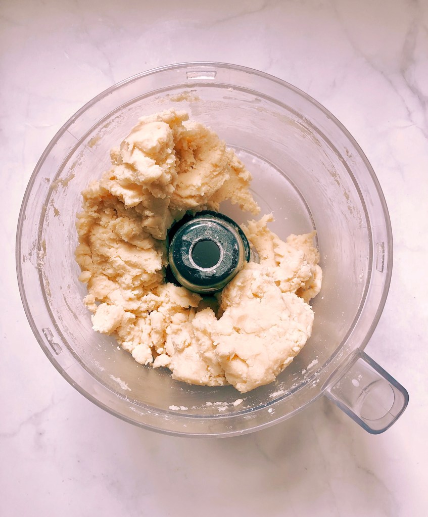 3. Feed two tablespoons of ice water at a time through the feed tube of the food processor, pulsing 4 to 5 times after each addition. Stop adding water when the mixture begins to form large clumps and pulls away from sides of the food processor. Do not process more than about 30 seconds. The amount of water that you will need may vary depending on the temperature in your kitchen, the brand of flour that you are using and how much water it absorbs… The quantities in the ingredients list are illustrative. I usually need around 8-10 Tbsps of water to get to the consistency I like.