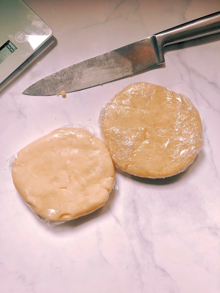 4. Turn the dough out onto your work surface and gather it into a ball. Divide it into two equal pieces, flatten each portion into a disk, cover with plastic wrap and refrigerate for at least 30-60 min before rolling it out if you want to use it in the same day so the butter has time to chill again. At this point you can also keep it in the fridge for up to 3 weeks or freeze the dough for about 3 months. Defrost the dough in the refrigerator for several hours or even overnight before using.