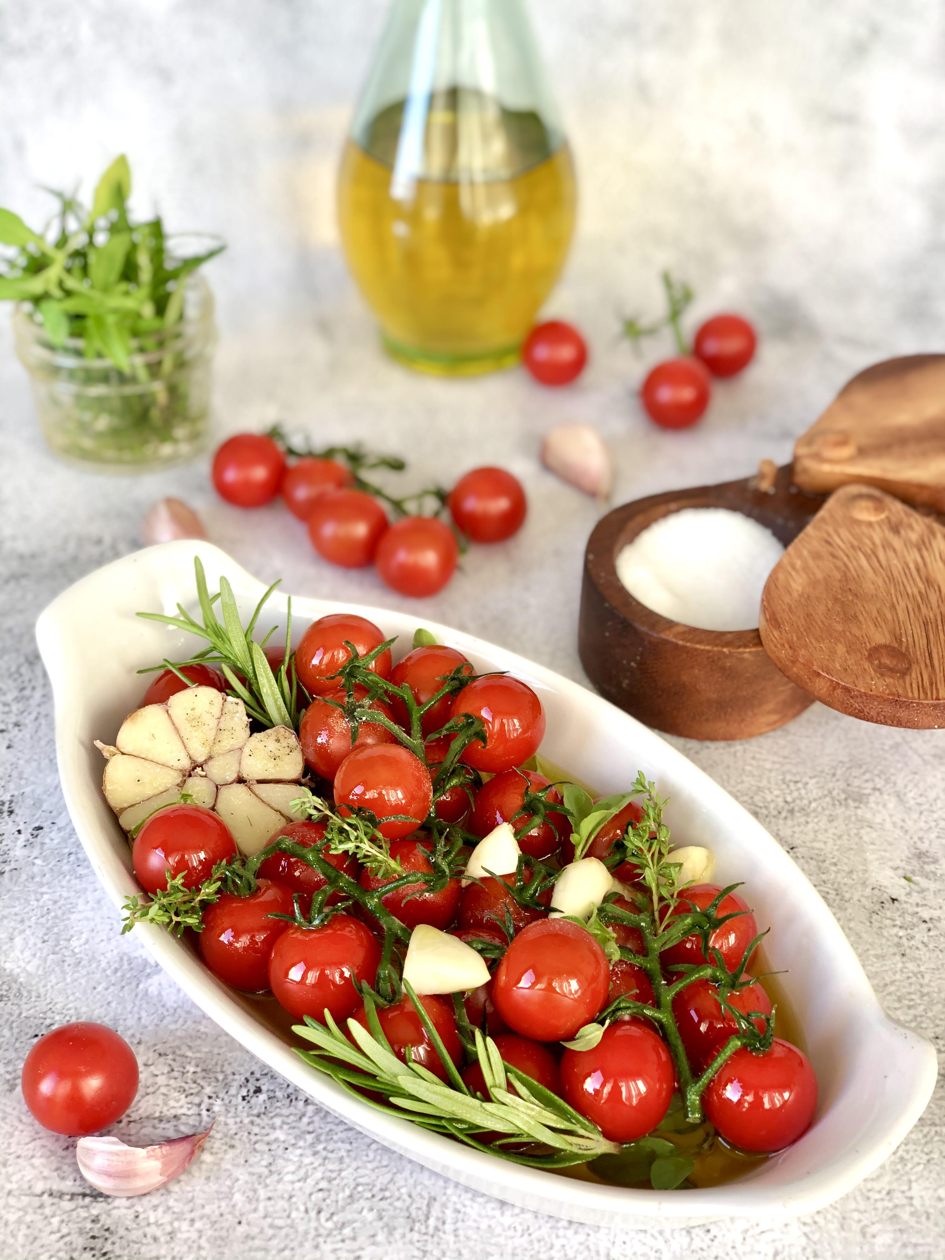 - Place the tomatoes, garlic and herbs into a small, deep baking dish. Season with salt and pepper and cover with the olive oil. Make sure the tomatoes, shallots, and garlic are at least half way submerged.