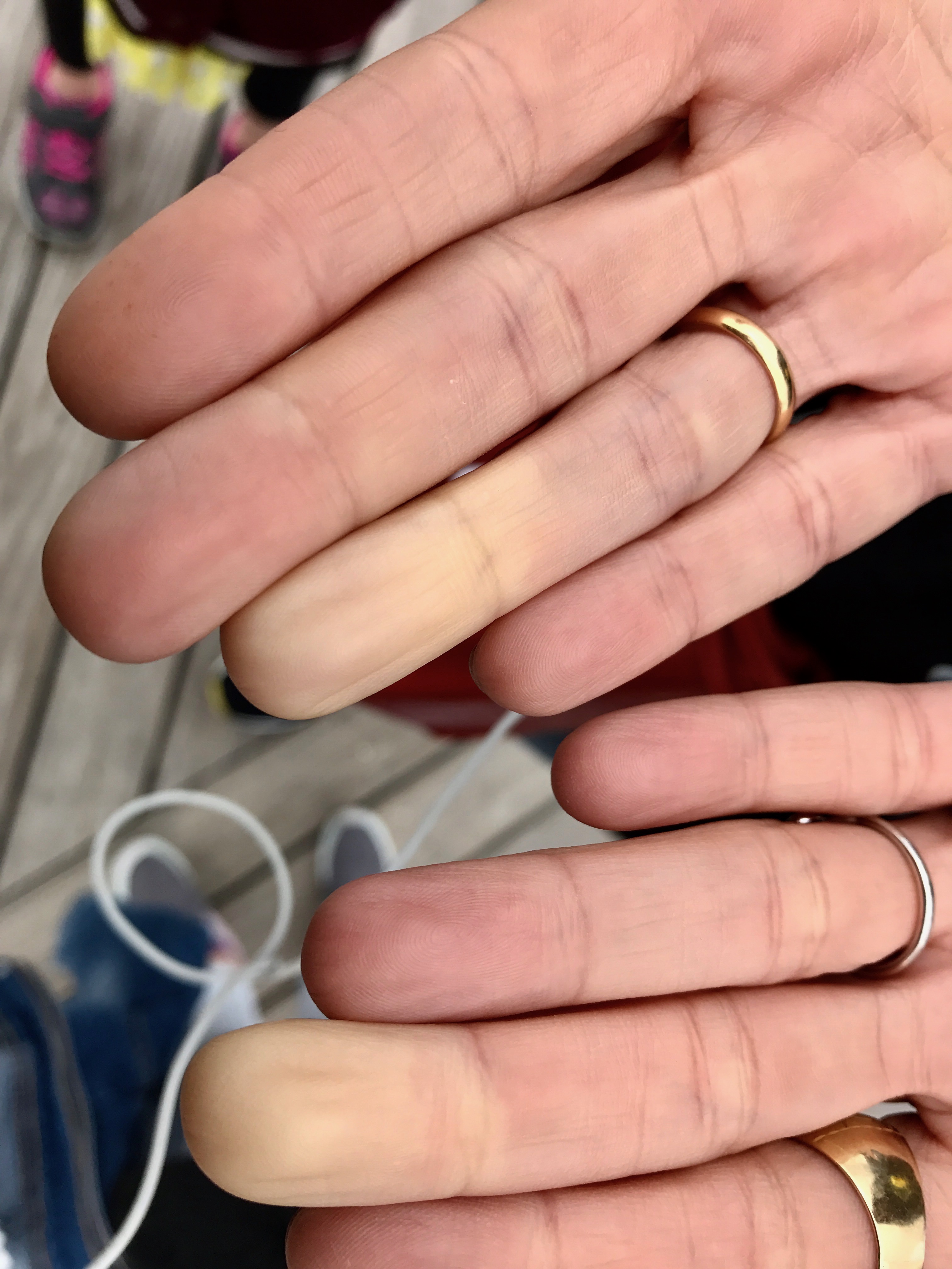 No habrás cogido unas bolsas muy cargadas y te has hecho daño en las manos y por eso se te han hinchado los nudillos?