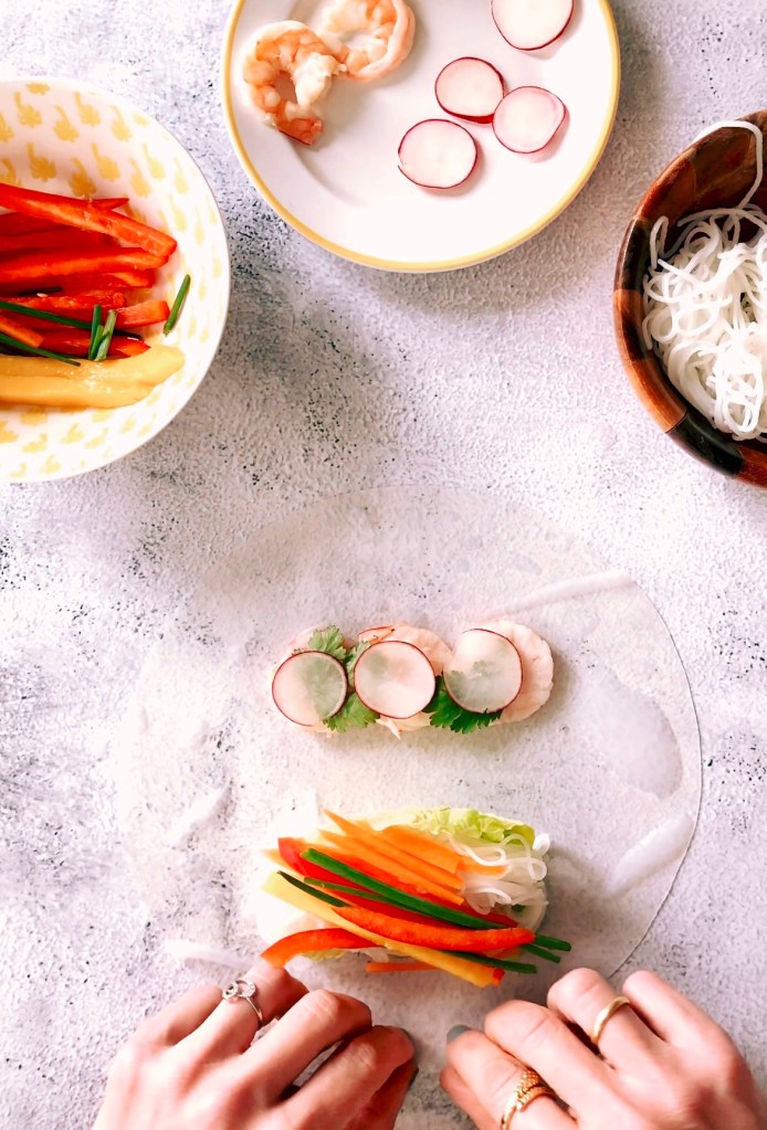 It takes practice but as you get the hang of it you may want to start experimenting with other ways to present your ingredients. I like to pile my ingredients in two different sections of the paper roll because that way I can have some of the filling show more once the roll is all rolled up. I like to do that especially when I am using shrimp. By leaving a gap between the shrimp and vegetables, the shrimp will look more vibrant in the final roll because they will be covered by only one layer of rice paper.