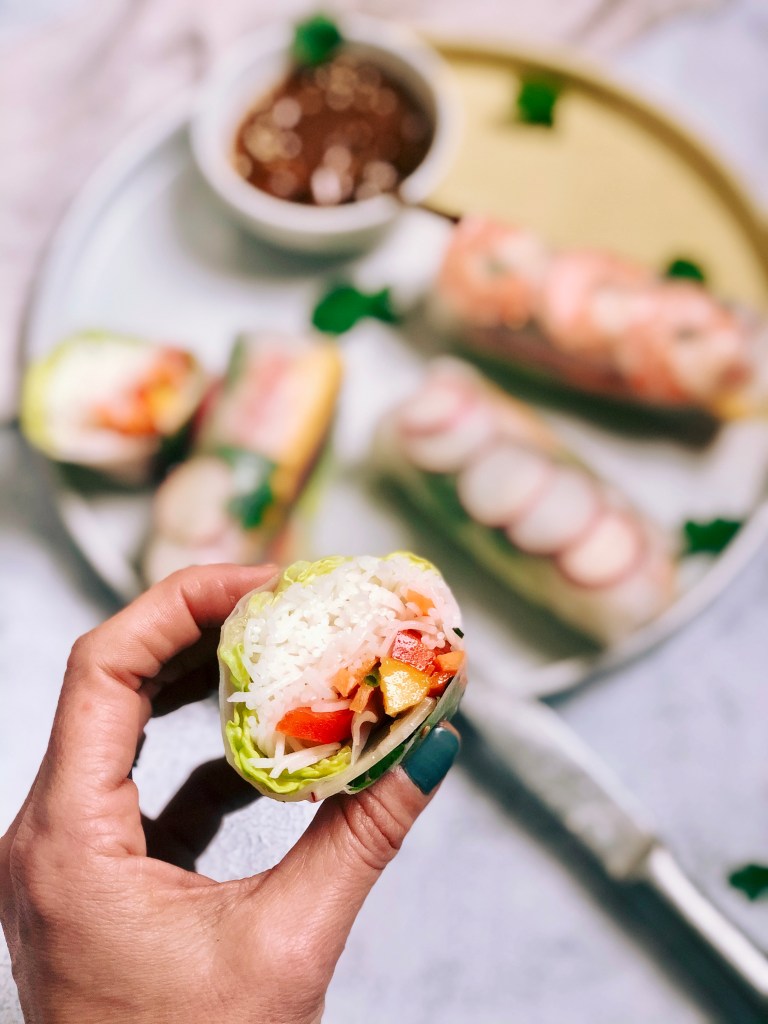 Los dos únicos elementos imprescindibles de esta receta son las obleas de papel de arroz y los noodles de arroz. Ambos eran más difíciles de encontrar hace algunos años pero hoy en día tenemos fácil acceso en cualquier supermercado. No quiero que se me olvide mencionar que otro punto positivo para estos rollitos es que son gluten-free!