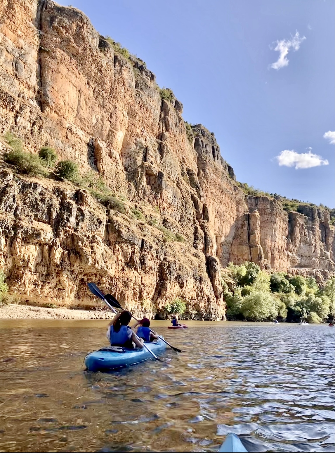 Se trata básicamente de recorrer un tramo de las Hoces del Río Duratón. No es el recorrido completo de las Hoces, sino sólo un tramo. Creedme que la sensación de estar dentro del agua en el centro del río con esos cortados verticales levantándose a ambos lados es indescriptible. Es de esos momentos que te hacen sentir tan pequeño en comparación con la inmensidad de la naturaleza, pero a la vez tan vivo por ser parte de ella. La excursión entera dura entre 3 y 4 horas. Nosotros empezamos a las 4 y acabamos a las 7.30.