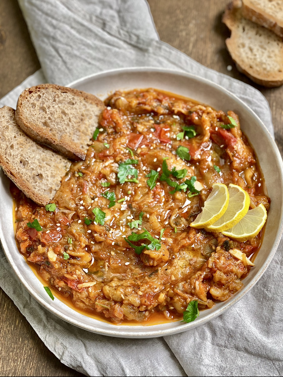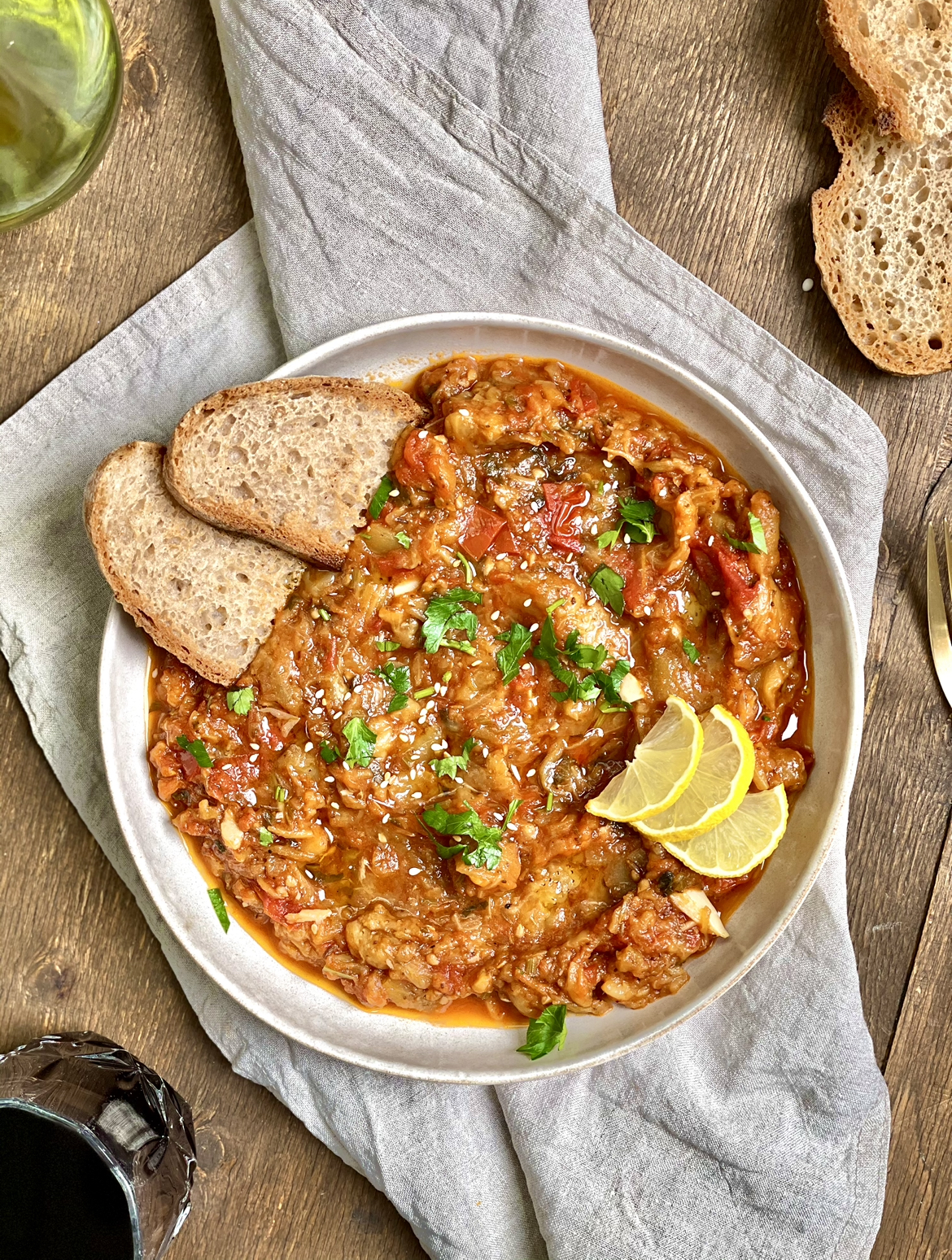 Zaalouk is a popular Moroccan cooked salad of eggplants and tomatoes seasoned with paprika, cumin, garlic, and herbs, that’s usually eaten as a dip with bread. It is served as a side to Moroccan main dishes and it holds the quintessential Mediterranean flavors and aromas.