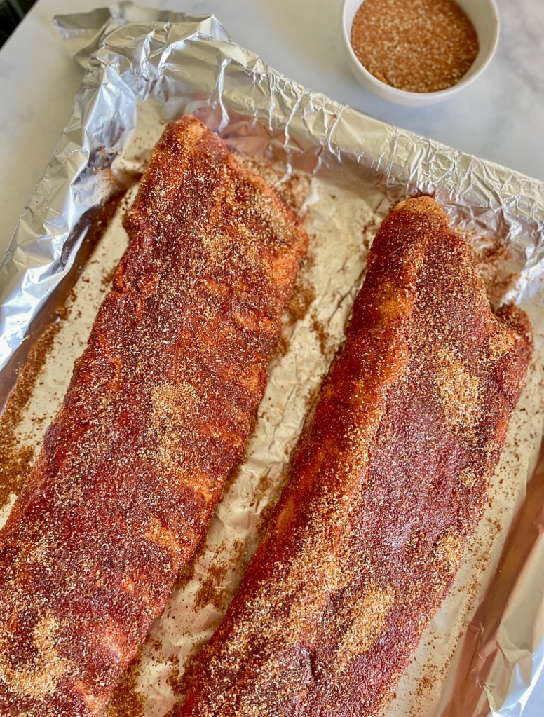 Es éste un aderezo SECO, es decir, no es un líquido o un ‘pringue’. en el que vayamos a marinar las costillas, sino una mezcla en polvo con la que vamos a “rebozar” toda la superficie de las costillas. El tiempo que deben permanecer las costillas con el aderezo puesto antes de proceder a asarlas es muy flexible. Pueden ser 15 minutos, pueden ser 3 horas, o puedes aderezarlas y asarlas directamente. La teoría dice que cuanto más tiempo tengan el aderezo, más sabrosas serán. No he podido confirmar empíricamente este particular porque siempre las hago directamente después de aderezar y el nivel de sabor, en mi opinión, es ya increíble.